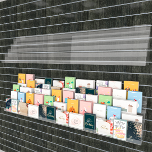 • This acrylic slatwall card rack is perfect for displaying greetings cards .