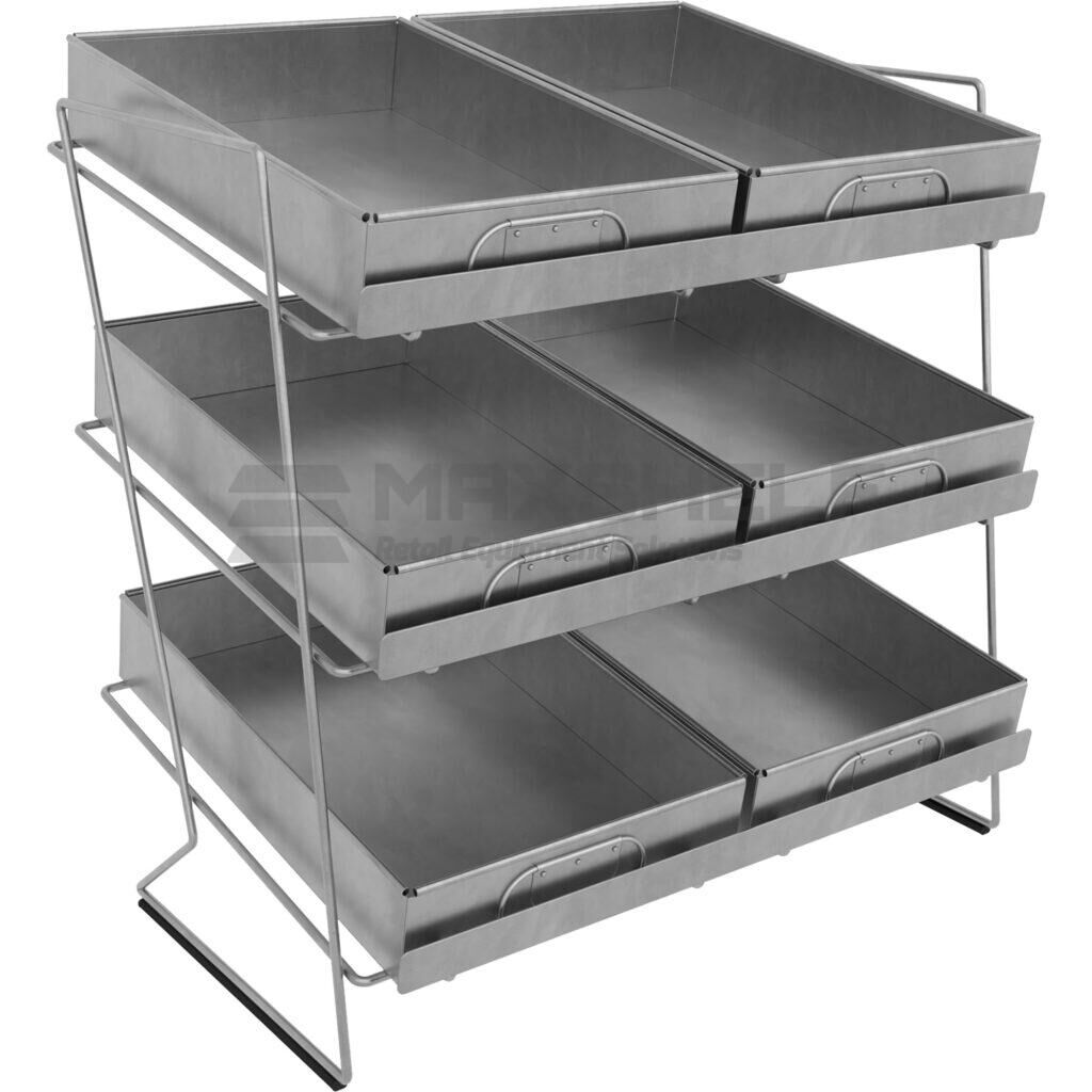 Elevate your product organisation with the heavy-duty Maxshelf 3 Tier Galvanised Metal Tray Display. This professional countertop fixture is engineered to provide maximum visibility and storage capacity within a compact footprint, making it an essential tool for high-traffic stores.