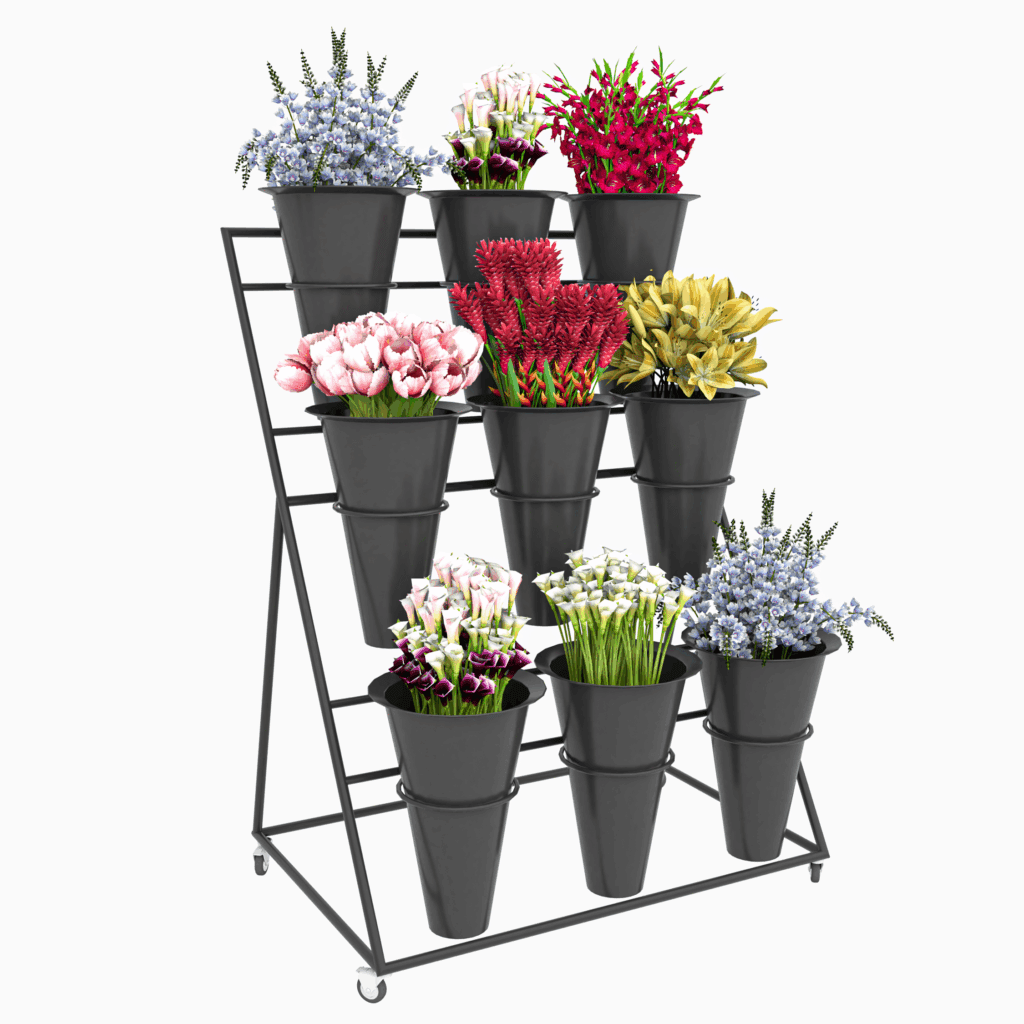 Showcase flowers beautifully with this 3-tier flower display stand, designed to maximize visibility while saving floor space. The tiered layout creates an attractive cascading presentation, making it ideal for retail environments such as florists, garden centers, and supermarkets.