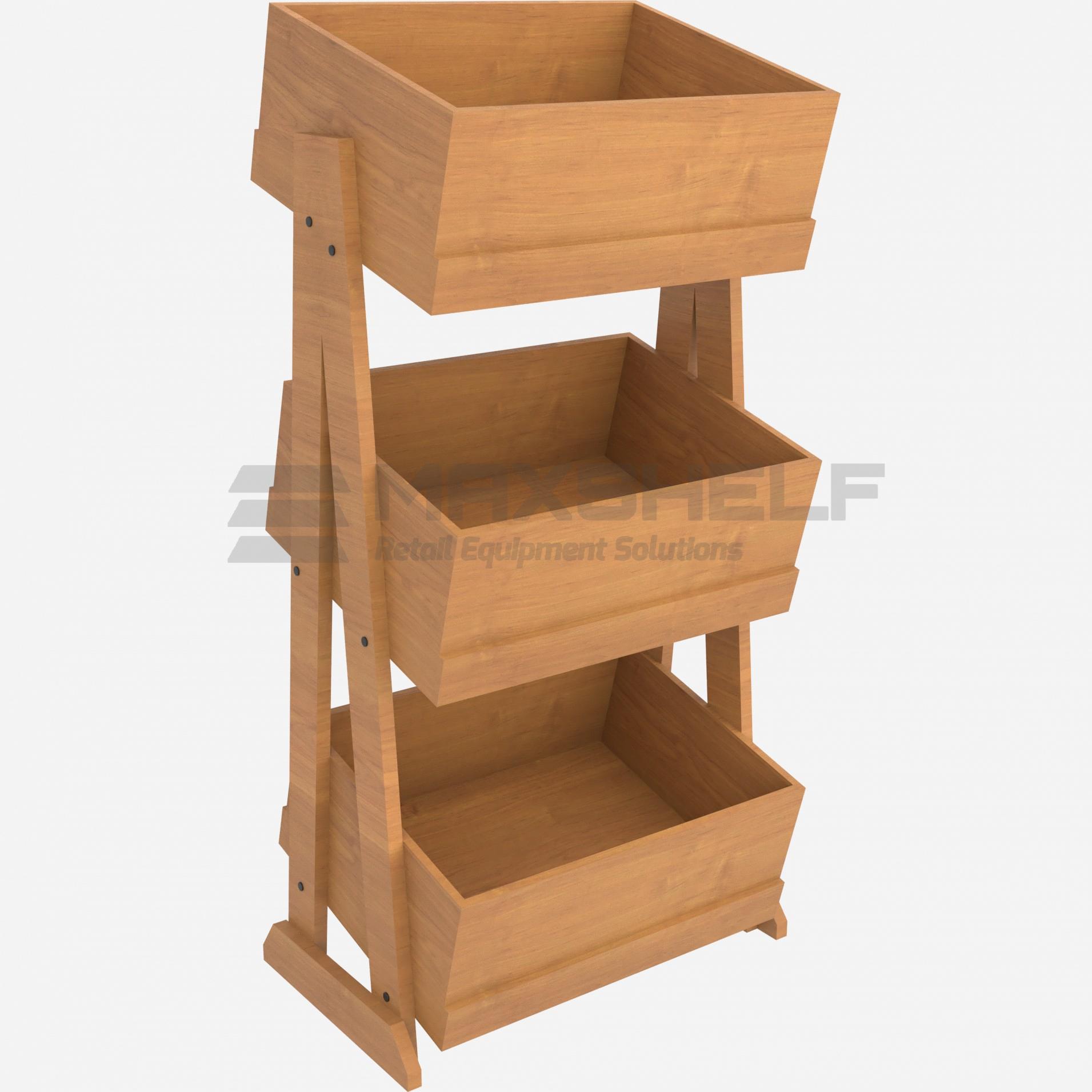 - Three Deep Display Tiers: Equipped with three spacious wooden bins, providing significant volume for bulk produce or large packaged items.
