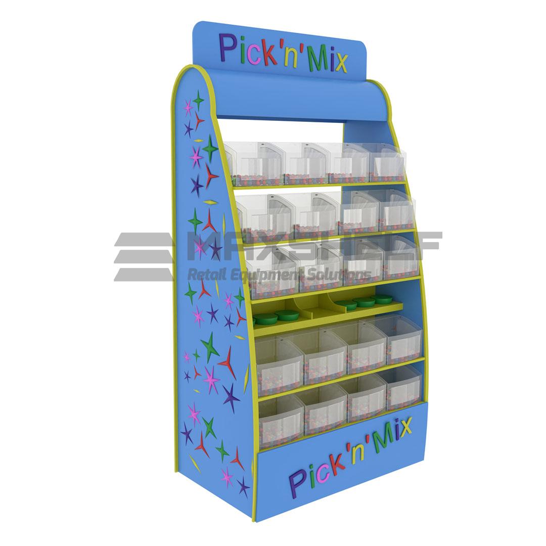 - Freestanding pick and mix sweets dispenser with graphics.
