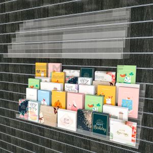 - This acrylic slatwall card rack is perfect for displaying greetings cards .