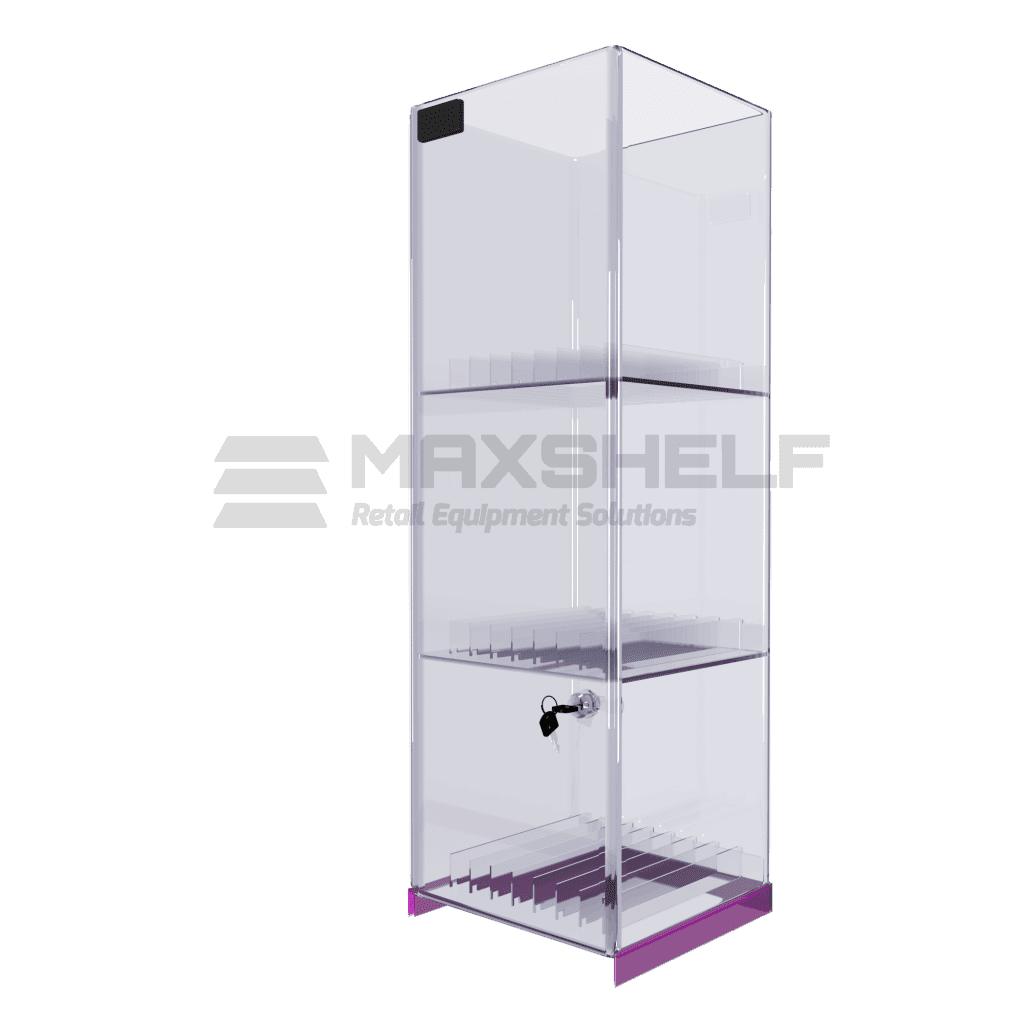 Showcase restricted products or valuable items with this front opening, locking acrylic cabinet with three shelves. This cabinet features three shelves that can accommodate a variety of different-sized products.