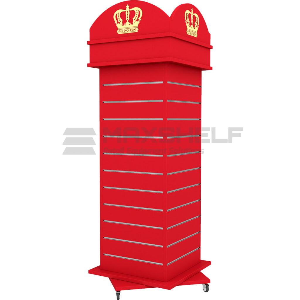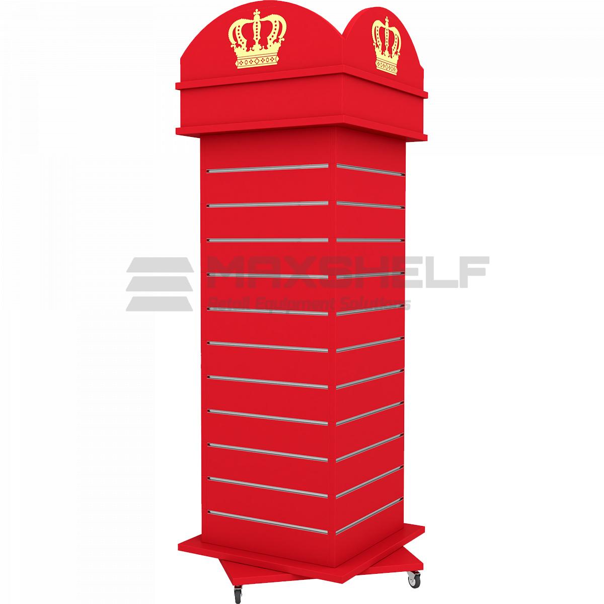 The vibrant red finish and telephone box-inspired crown signage make the unit instantly recognisable, drawing customers’ attention from a distance. Built on a sturdy castor base, it can be easily moved around the store to refresh layouts or highlight seasonal promotions. The slatwall panels are compatible with a wide range of hooks, shelves and display accessories, allowing full flexibility in how products are arranged.