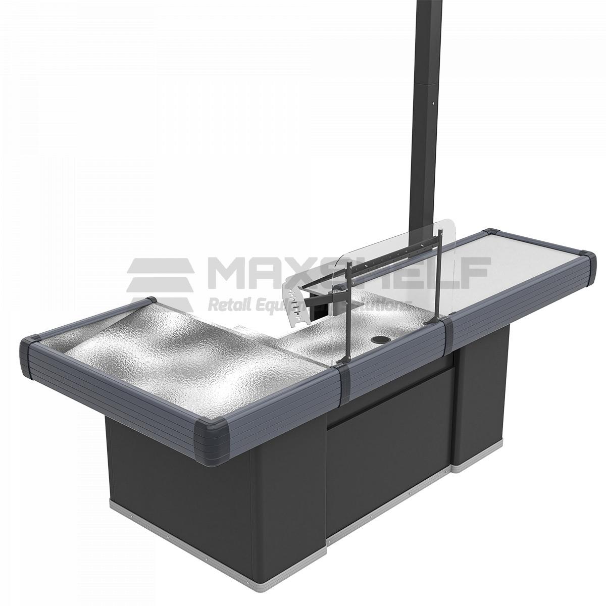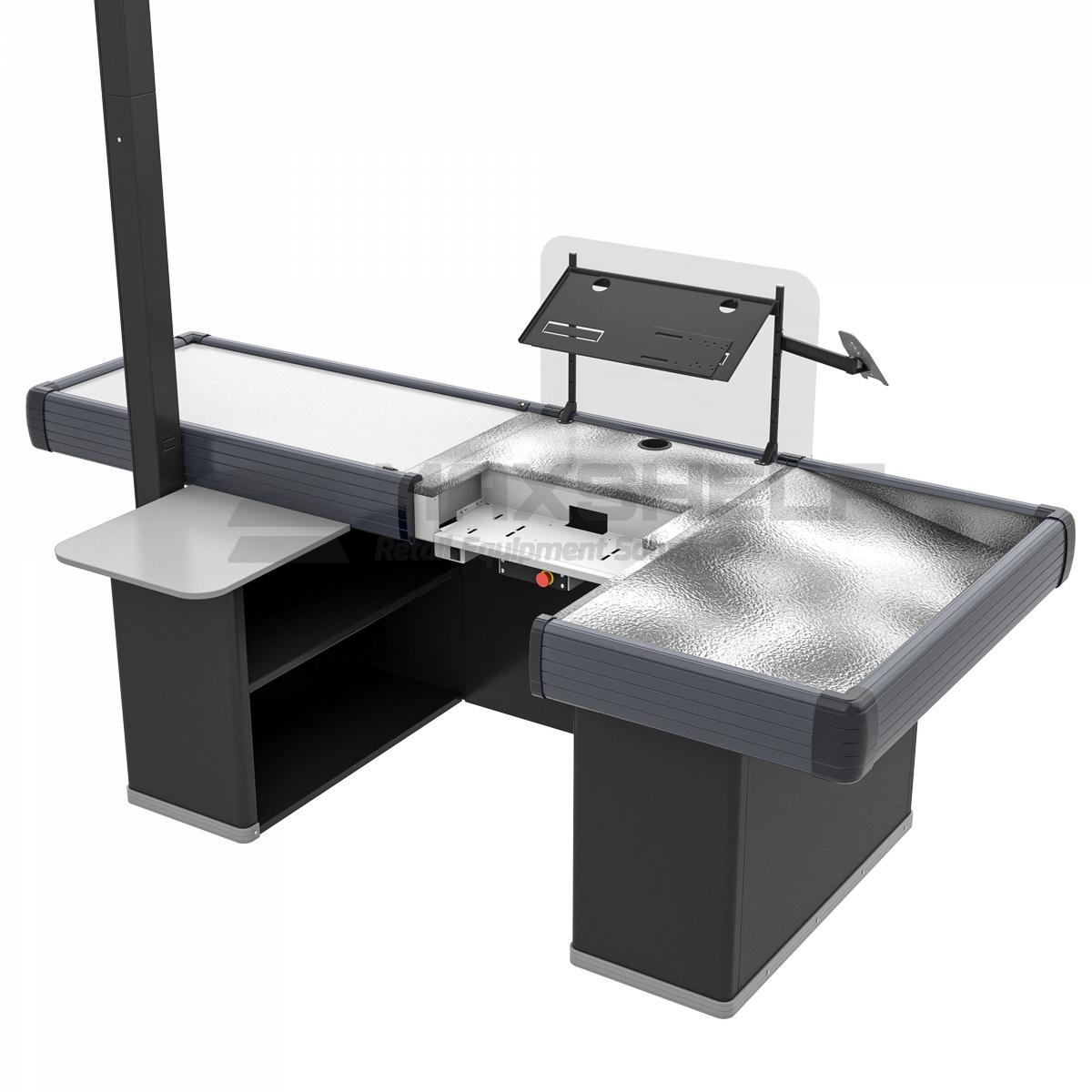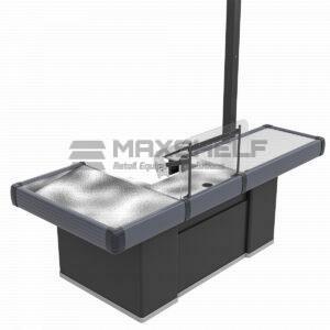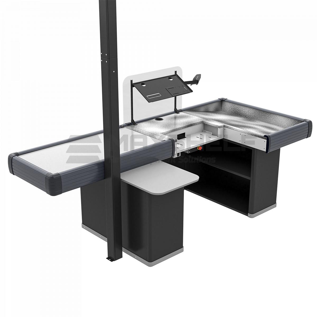 The central workstation includes space for a POS terminal, barcode scanner, and cash drawer, with a convenient side shelf for additional workspace. The textured stainless-steel bagging area provides a durable, easy-to-clean surface for packing goods, while the sturdy base cabinets offer room for storage and cable management. An emergency stop button ensures safety during operation.
