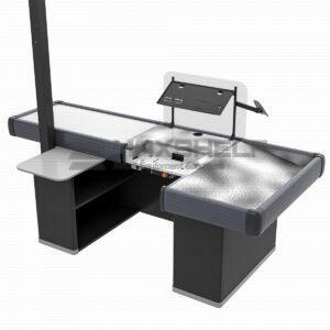 This modern supermarket checkout counter combines functionality, durability, and sleek design — ideal for grocery stores, convenience shops, and retail environments. Engineered for smooth customer flow and cashier efficiency, it features an integrated motorized conveyor belt that automatically moves products toward the scanning area, reducing manual handling and increasing checkout speed.