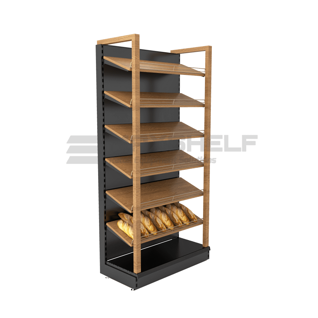 METAL BAKERY UNIT WITH COLUMN AND WOODEN SHELVES