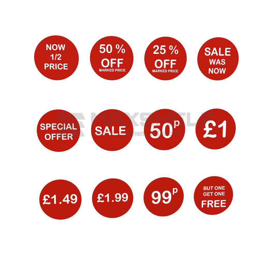 | Text | £1.49, £1.99, 25% Off Marked Price, 50% Off Marked Price, 50p, 99p, Buy One Get One Free, Now 1/2 Price, SALE Was Now, SALE, Special Offer, £1 |
